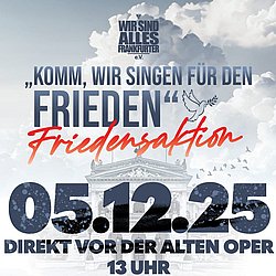 Über 120 Firmen, Schulen, Vereine, Gastronomiebetriebe, Sportvereine und Musiker singen gemeinsam für den Weltfrieden am Freitag, 5. Dezember, 13 Uhr, direkt vor der Alten Oper in Frankfurt. Auch die katholische Stadtkirche beteiligt sich an dieser Friedensaktion.