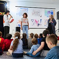 Katholische Stadtkirche Frankfurt Kinderfest großer Erfolg Bericht FBS Sigrid Kemler (mit Mikro) und Mitarbeiterinnen begrüßen die Kinder und Eltern. Frankfurt, 16.06.2025 Kinderfest großer Erfolg Zah