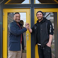 Katholische Stadtkirche Frankfurt Kleine Kirche, lang erwartet Bericht A. Zegelman / Bistum Limburg George Kurumthottikal (links) nimmt den Schlüssel von Tiny-House-Bauer Johannes Mager entgegen. Fran